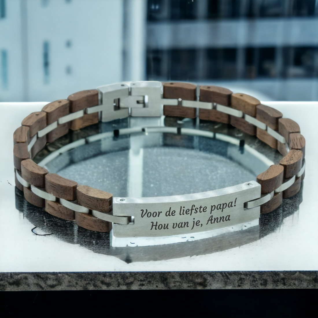 'Eigen gedicht op armband gravure' - Brede RVS Houten armband