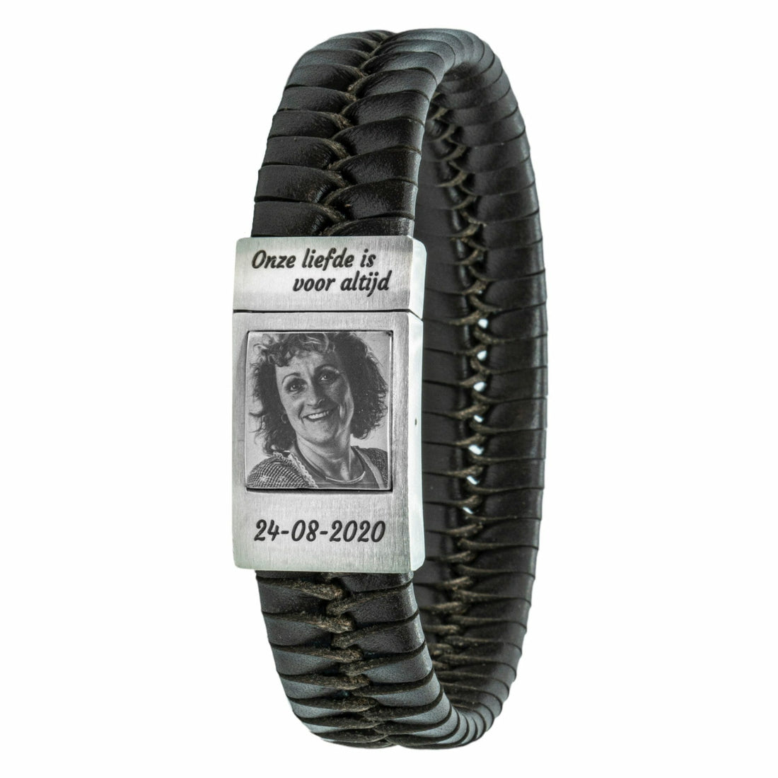 Heren fotoarmband met Gevlochten leer zwart / bruin met eigen foto