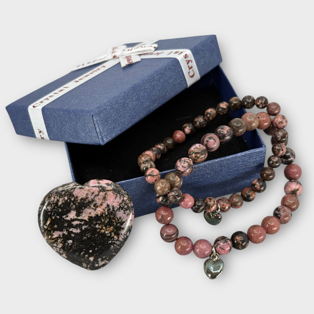 Rhodoniet Armbanden Set met Hartvormige Steen – Balans & Liefde