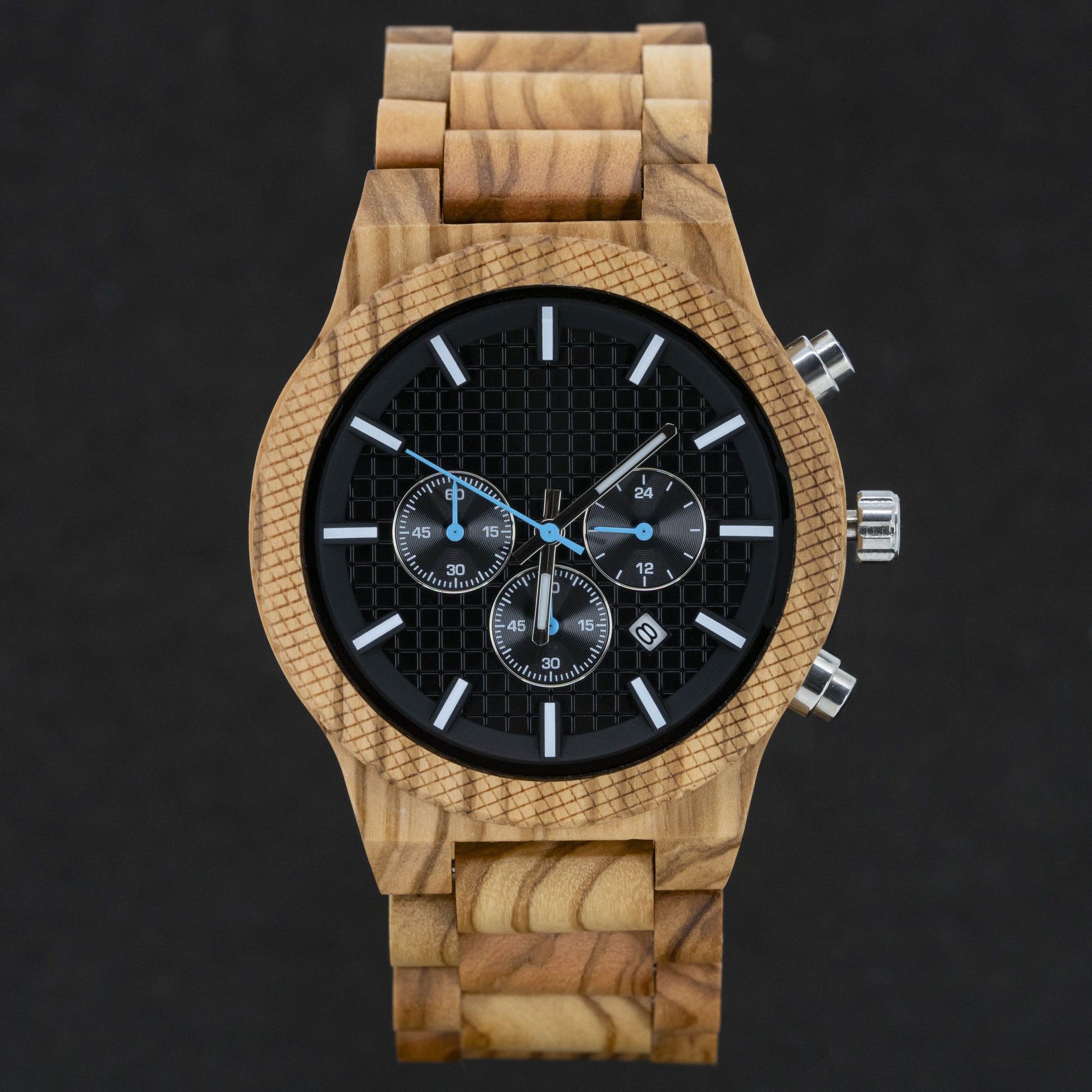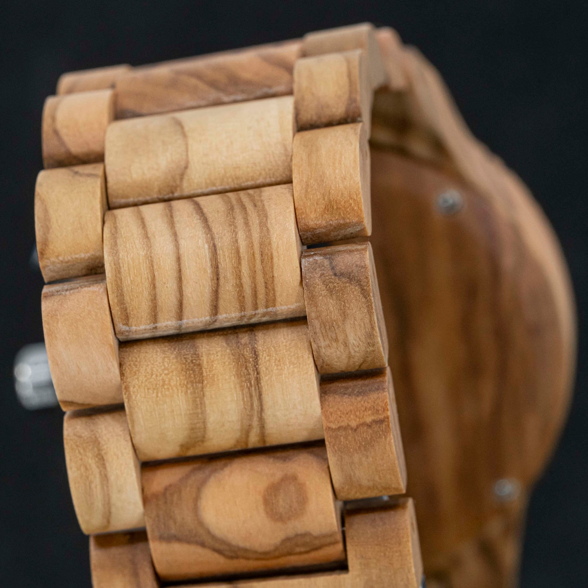 Het mechanische uurwerk houdt de koers betrouwbaar bij, terwijl de olijfhouten kast een warme, natuurlijke uitstraling geeft. Lichtgewicht en verstelbaar, blijft het horloge strak op de pols – klaar voor elke missie.