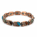Deze stijlvolle koperen dames magneetarmband combineert elegantie met welzijn. De armband is vervaardigd uit hoogwaardig koper en is ingelegd met prachtige halfedelstenen zoals turquoise, tijgeroog, goudsteen en aventurijn.