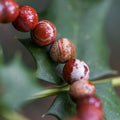 De kralen van deze armband zijn gemaakt van Red Sesame Jasper (naturel), welke een vergelijkbaar uiterlijk heeft als de Verweerde Jasper. De donkere tinten van baksteenrood en grijze strepen in combinatie met doorschijnende kwartsinsluitsels geven deze armband een unieke uitstraling.