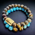 De tweede armband is gemaakt van natuurlijke Afrikaanse turquoise Jasper kralen van 8mm. Het design wordt verrijkt door twee grote tijgeroog kralen van 10mm. Deze combinatie zorgt voor een uniek en opvallend accessoire om je pols.